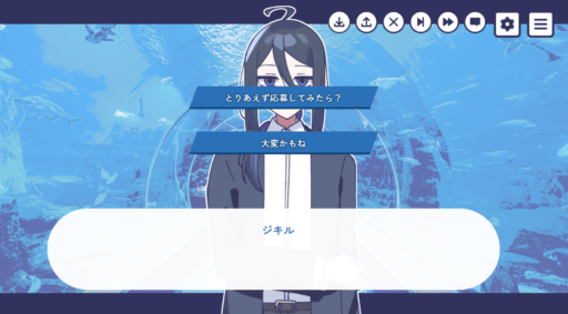 3回目の水族館で、清掃スタッフに応募するかしないか選択があります。